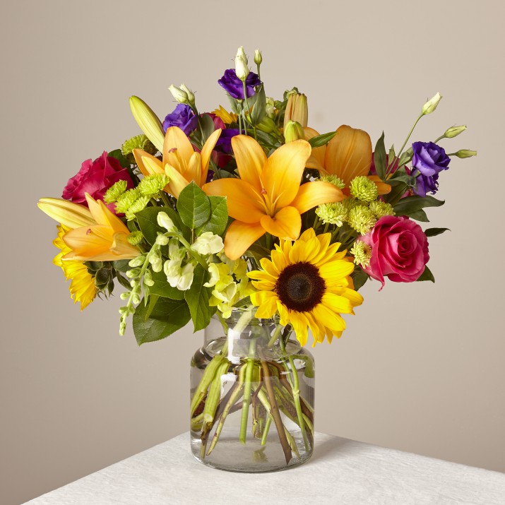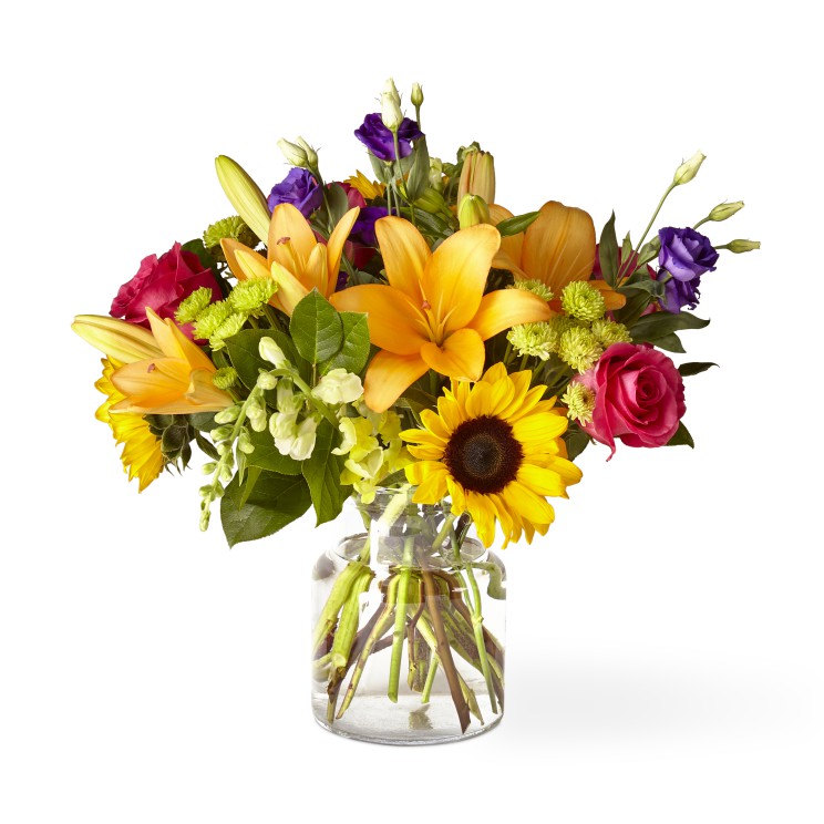 Share the happiness of life with the “Happiness Bouquet,” which features Sunflowers, Green button Mums, Lilies, Lisanthuis, and Roses in a transparent vase with Salal leaf.