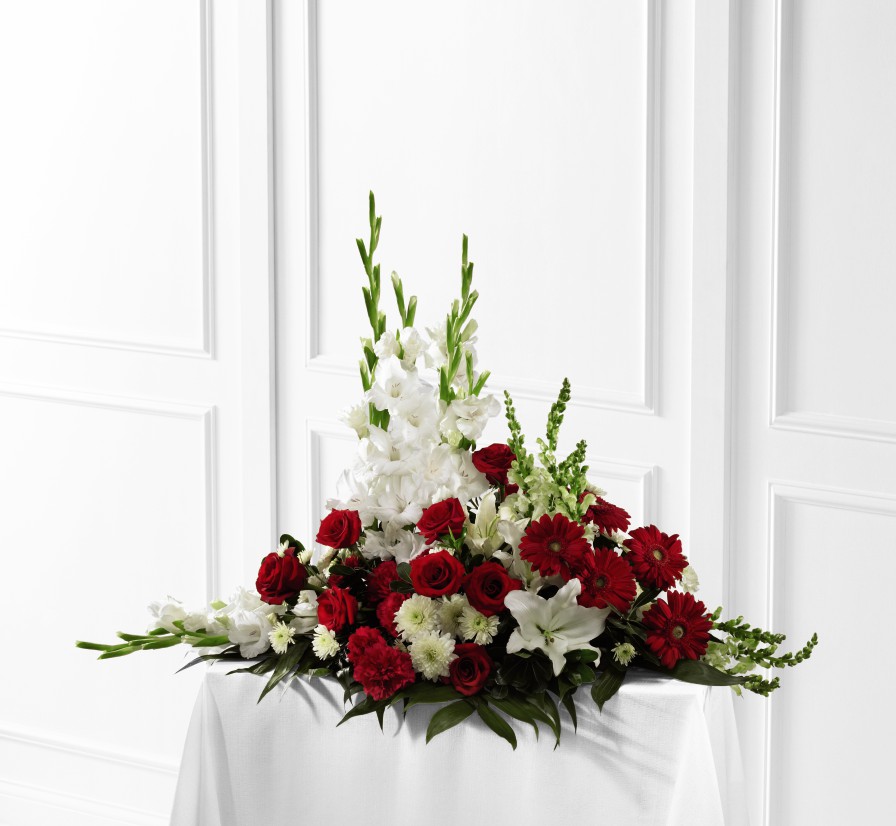 This touching Casket mist, nestled in a bouquet of the prettiest red and whites, will say a heartfelt goodbye to a loved one. This heartfelt bouquet contains Roses, Lilies, Carnations, Gerbera, Crythumums, Snap Dragons, Delirium.