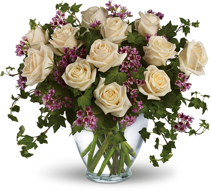 Elegant arrangement with white roses, purple wax flower and ivy placed in a clear bowl vase gives a perfect table centrepiece for your special occasion or just because.