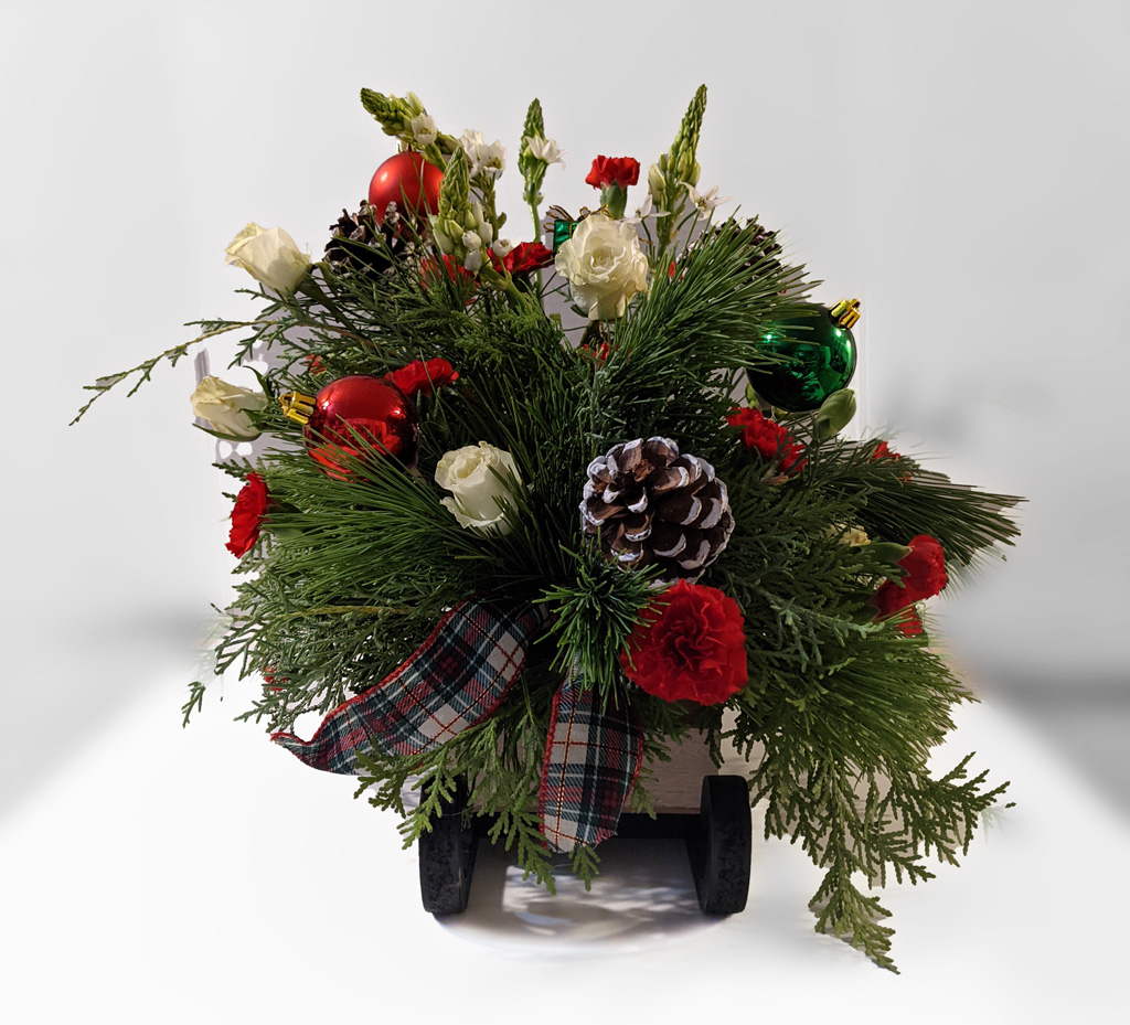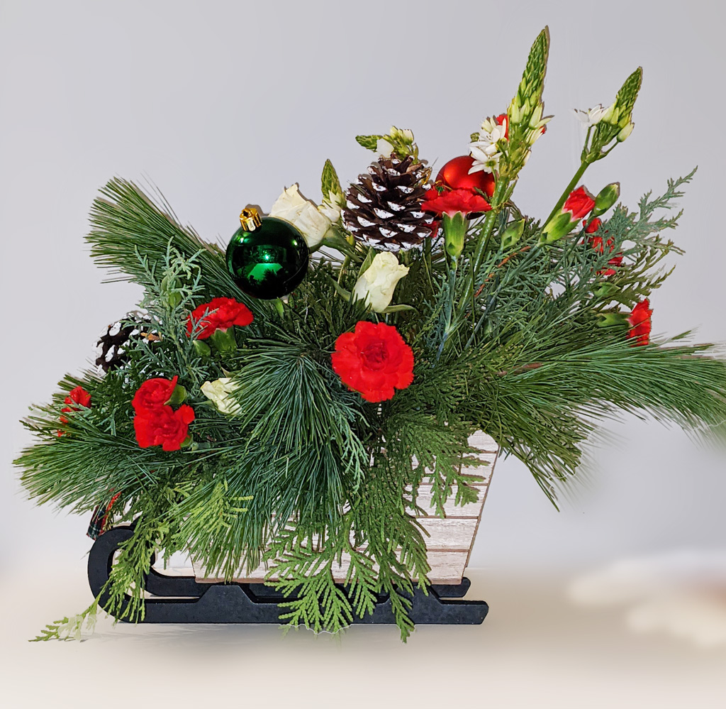 Miniature white Roses, miniature red carnations, star of Bethlehem are accented with cedar, pine and pine cones arranged in a wooden Sleigh complemented with a bow and ornaments.
