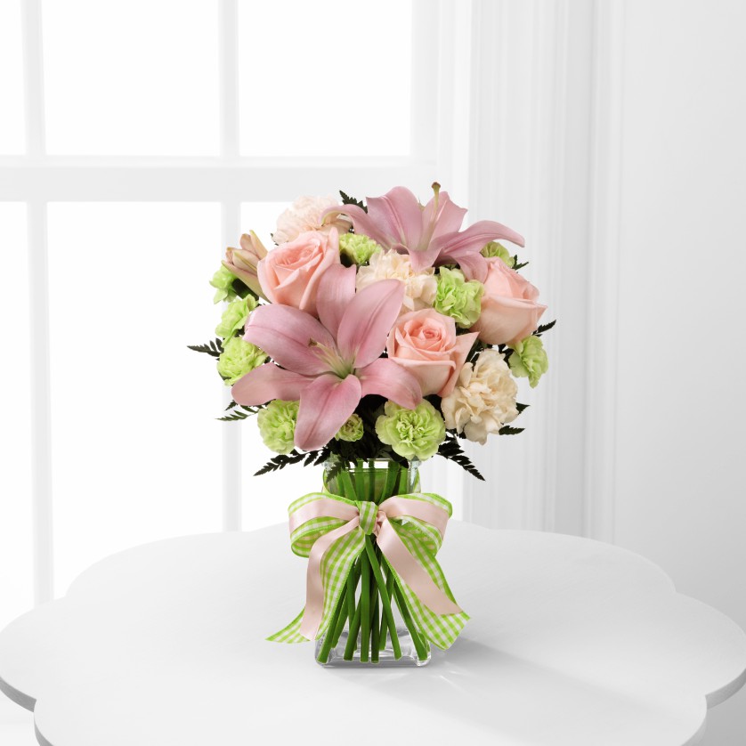 Lilies, Carnations, Roses in a clear vase dressed in a ribbon will show how much you love them to the moon and back!