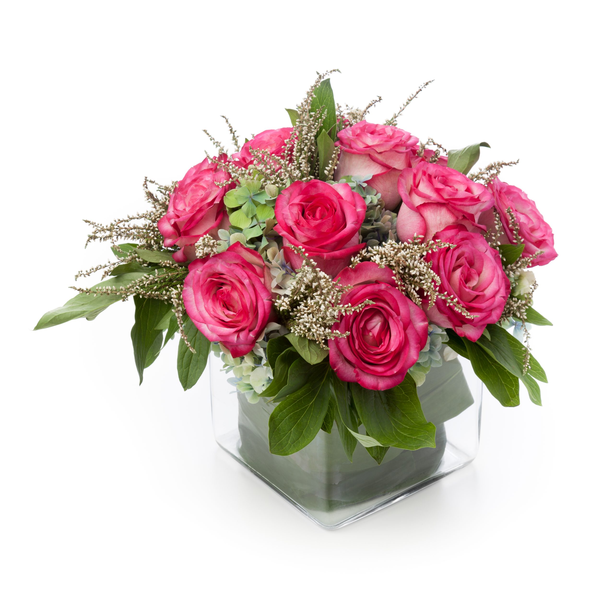 This beautiful Sensational arrangement is made of 10 Fresh pink roses, Hydrangeas and white stock flower designed with Beauty wrapped in salal leaf in a clear vase.