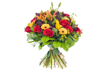 Bring comfort and warmth into your home with shades of autumn. Yellow mini Gerbera Daisies, Red Roses, Orange Lillies, Yellow calla lilies and Salal.