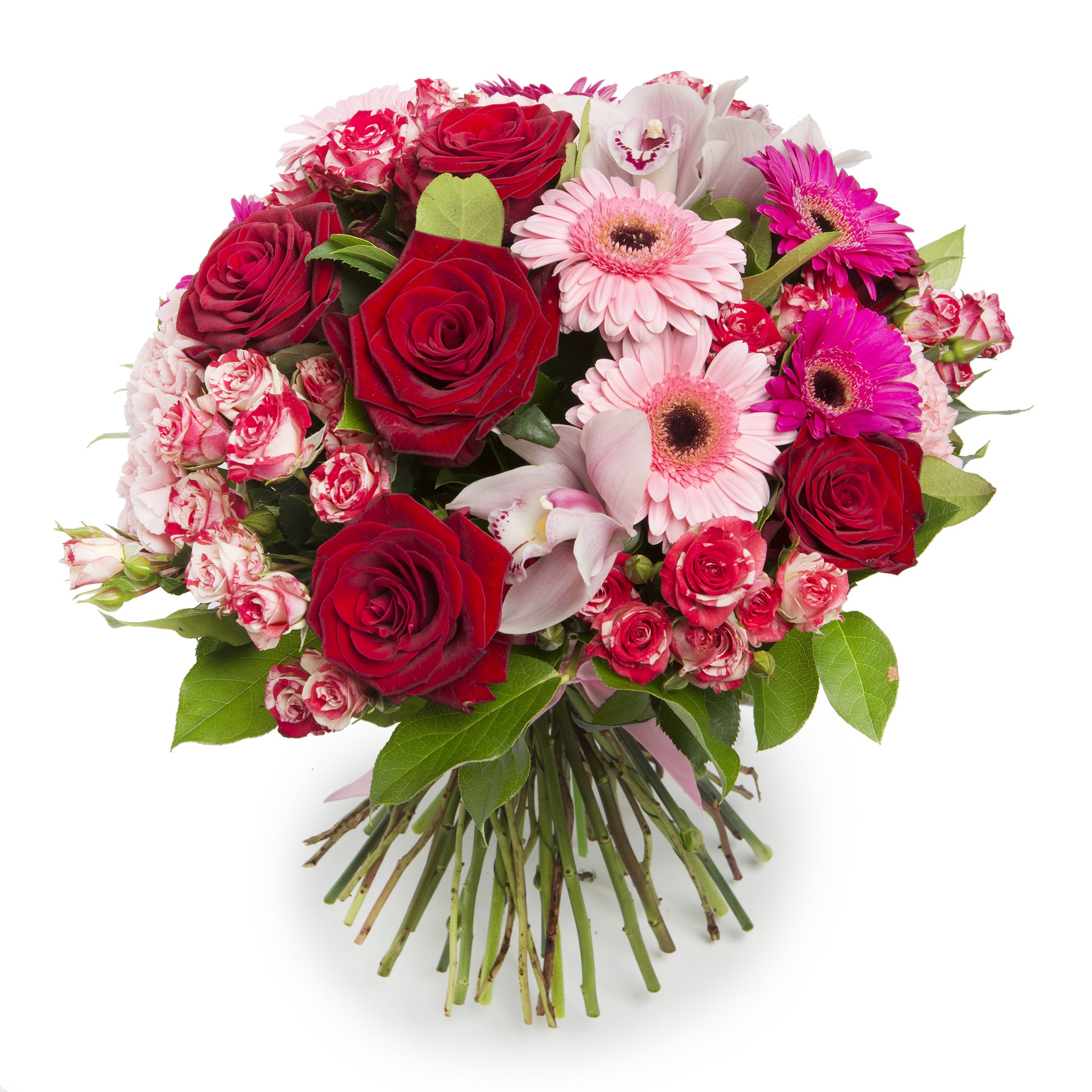 A gift of flowers can set the mood, A beautiful way to express your feelings to your loved one with sweet beauty. Red Roses, combination of Pink Gerbera Daisies, variation pink Carnations and mini roses along with orchids, salal leaf.